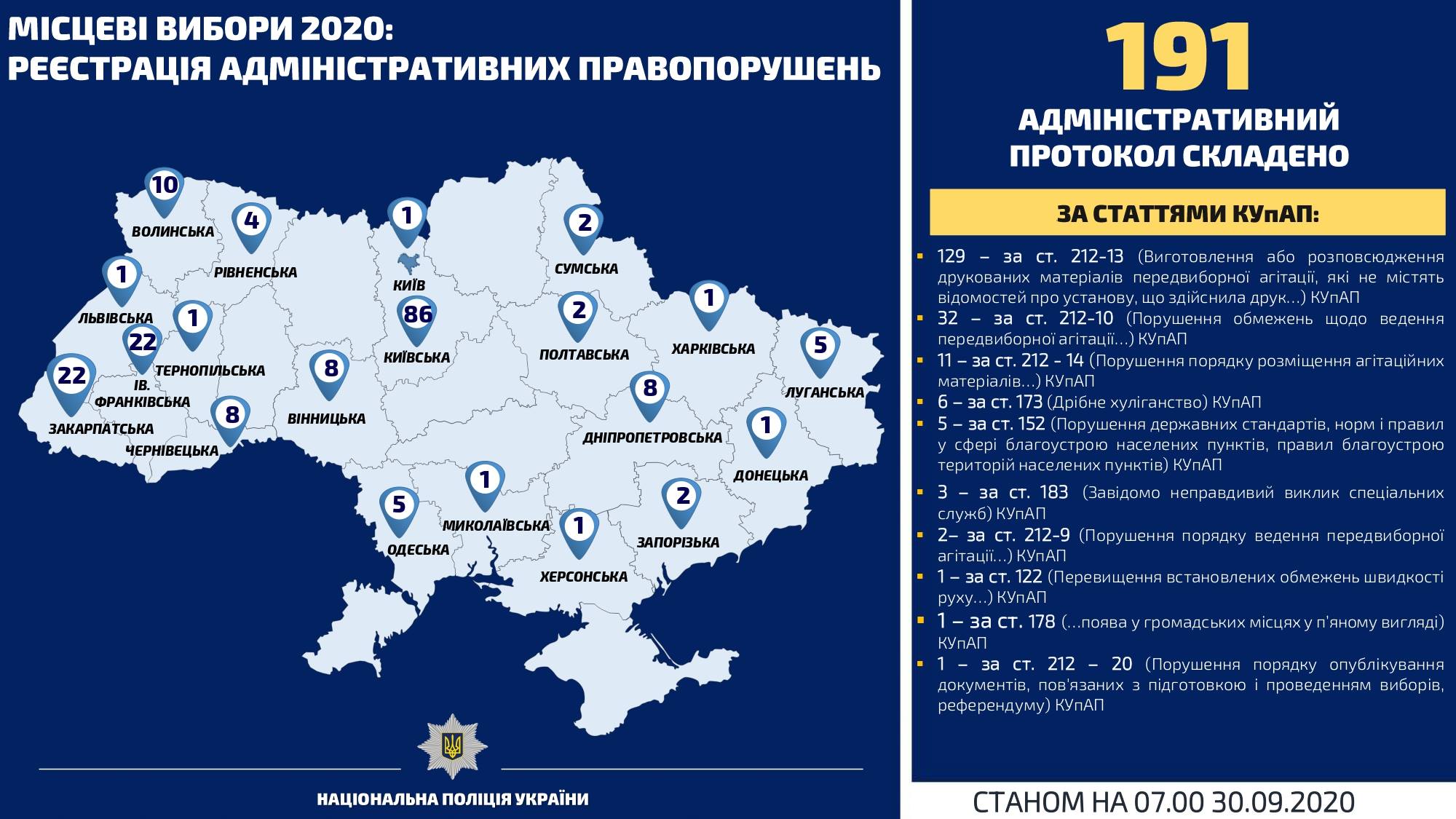 Також складено 191 протокол про вчинення адміністративних правопорушень, пов’язаних з виборчим процесом.