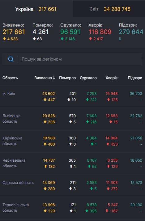 За сутки 1 октября в Украине коронавирусную болезнь подтвердили 4633 людям, умерли 68 больных.