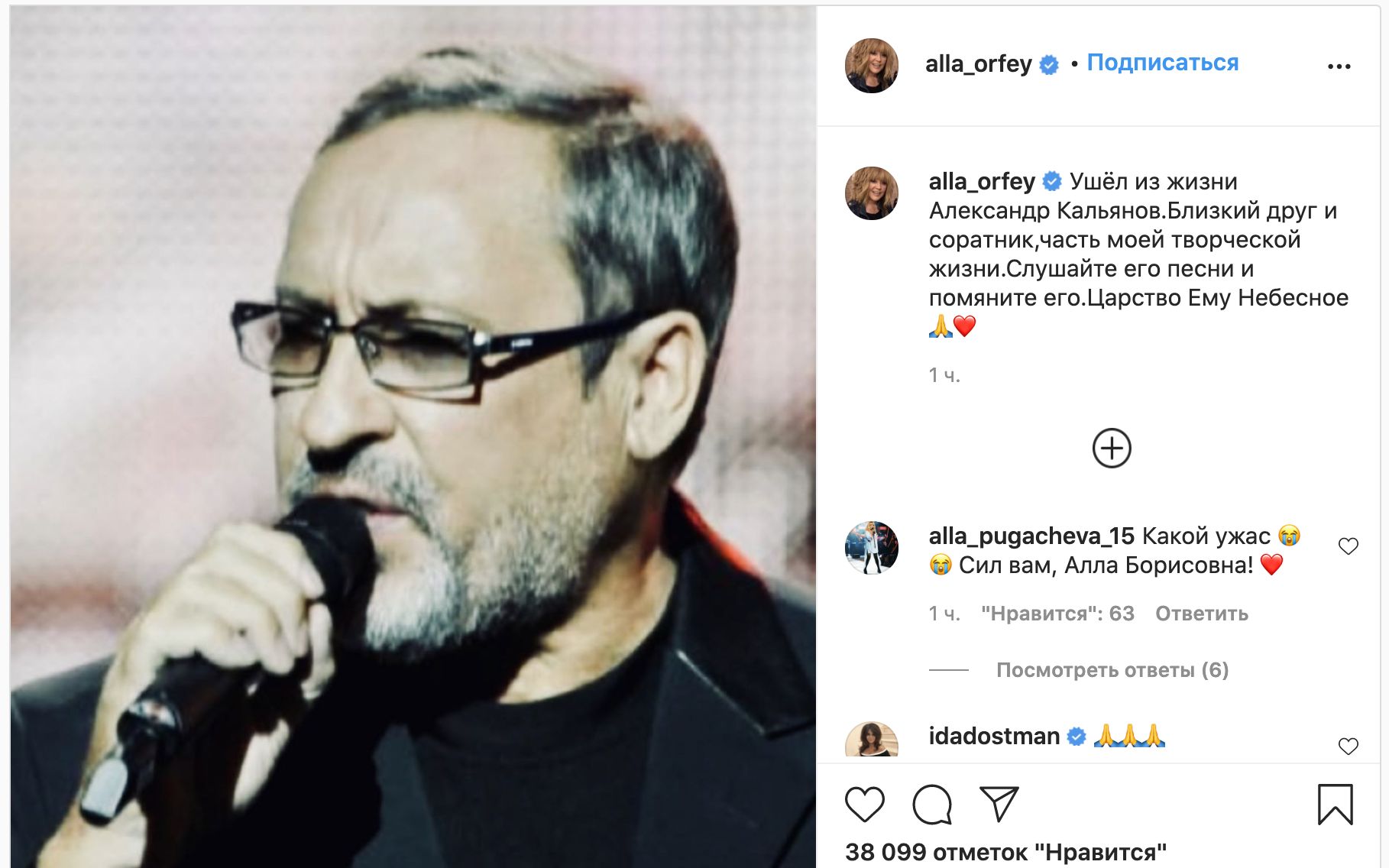 «Ушел из жизни Александр Кальянов. Близкий друг и соратник, часть моей творческой жизни. Слушайте его песни и помяните его», — сообщила Пугачева.