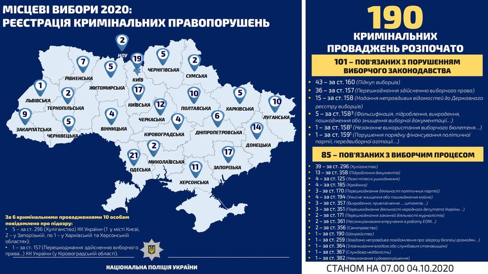 Всего в ЕРДР внесены сведения о 190 уголовных правонарушений: 101 - связаны с нарушением избирательного законодательства, 85 - с избирательным процессом.