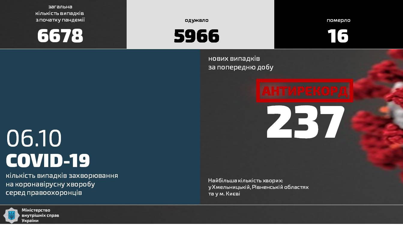 Наибольшее количество больных COVID-19 работников МВД зарегистрировано в Хмельницкой области (20), в Ровенской области (19) и г. Киеве (50).
