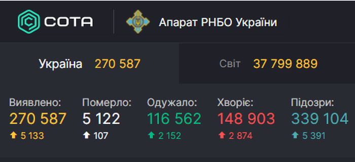 С начала пандемии в Украине коронавирус подтвердили у 270 587 человек, из них 5122 (+107 за сутки) умерли, 148 903 (+2874) выздоровели.