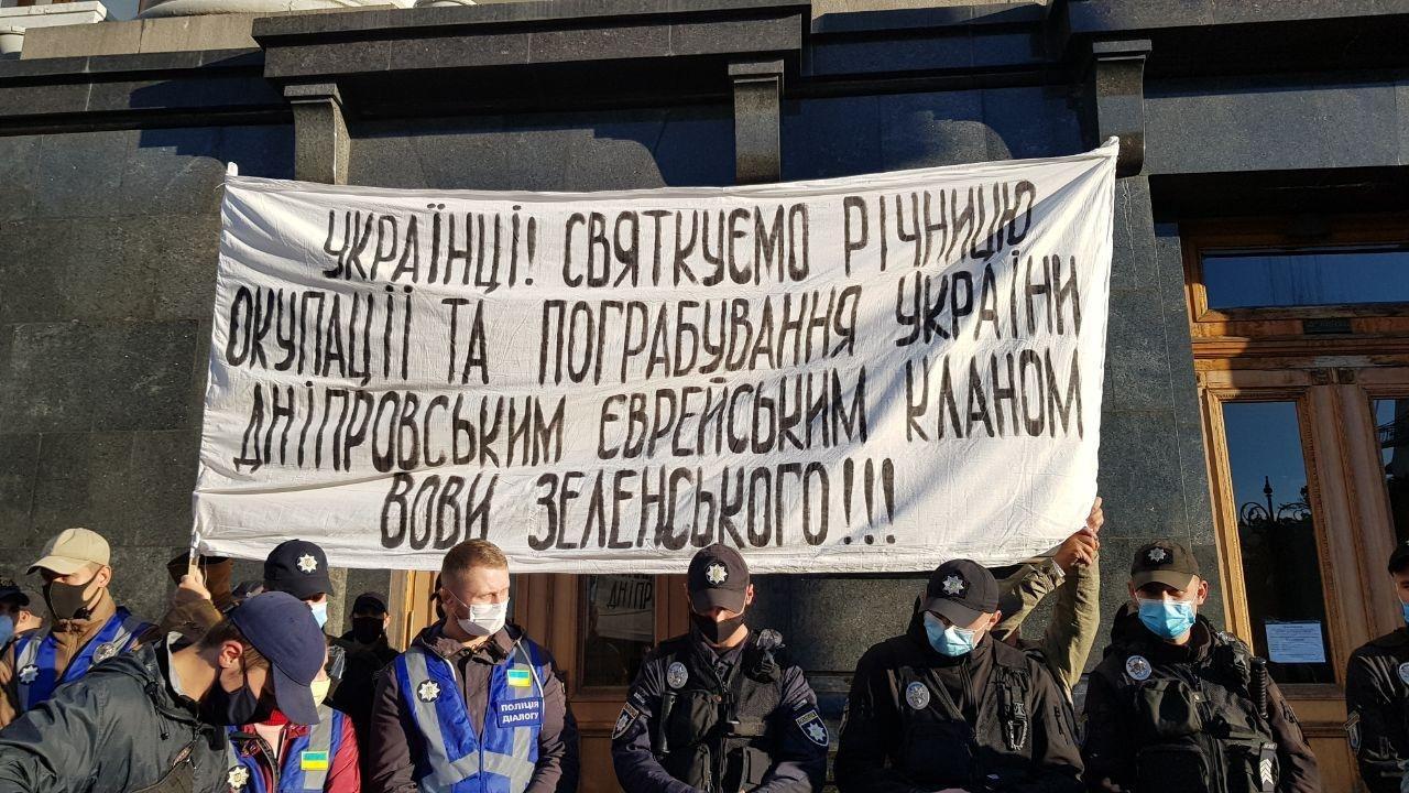 "В полицию Киева с официальным письмом обратился исполнительный директор Объединенной еврейской общины Украины. Он сообщил, что вчера, 14 октября, возле здания Офиса президента Украины в Киеве неизвестные развернули баннер с антисемитскими высказываниями", - сообщает отдел коммуникации полиции Киева на странице в Facebook.