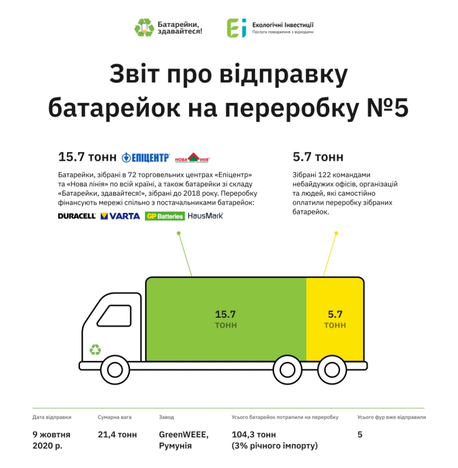 На румынский завод Greenweee отправили уже пятую фуру с украинскими батарейками, сообщают организация "Батарейки, сдавайтесь".