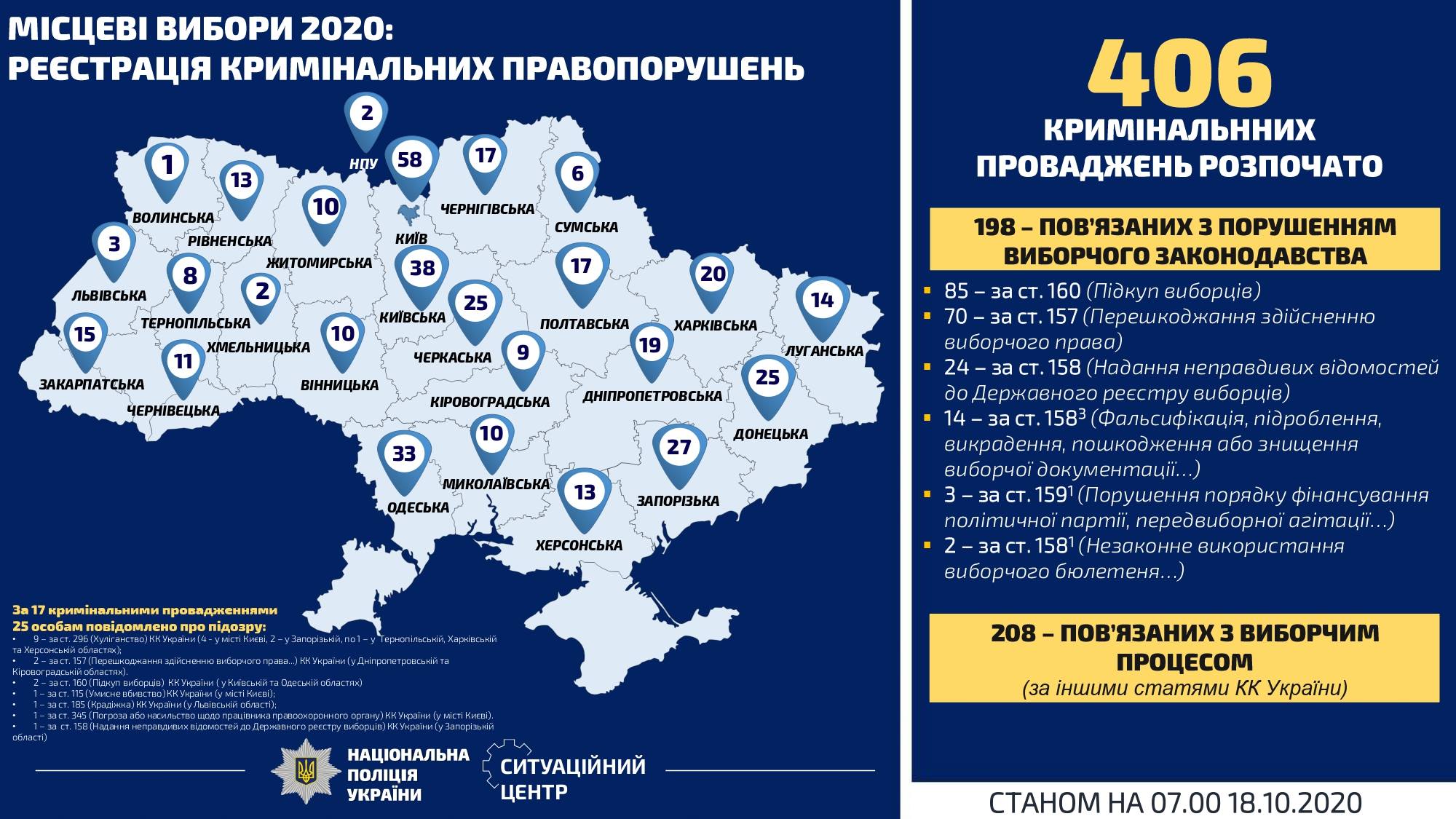 Усього до ЄРДР внесено відомості щодо 406 кримінальних правопорушень: 198 - пов’язані з порушенням виборчого законодавства, 208 – пов’язані з виборчим процесом.