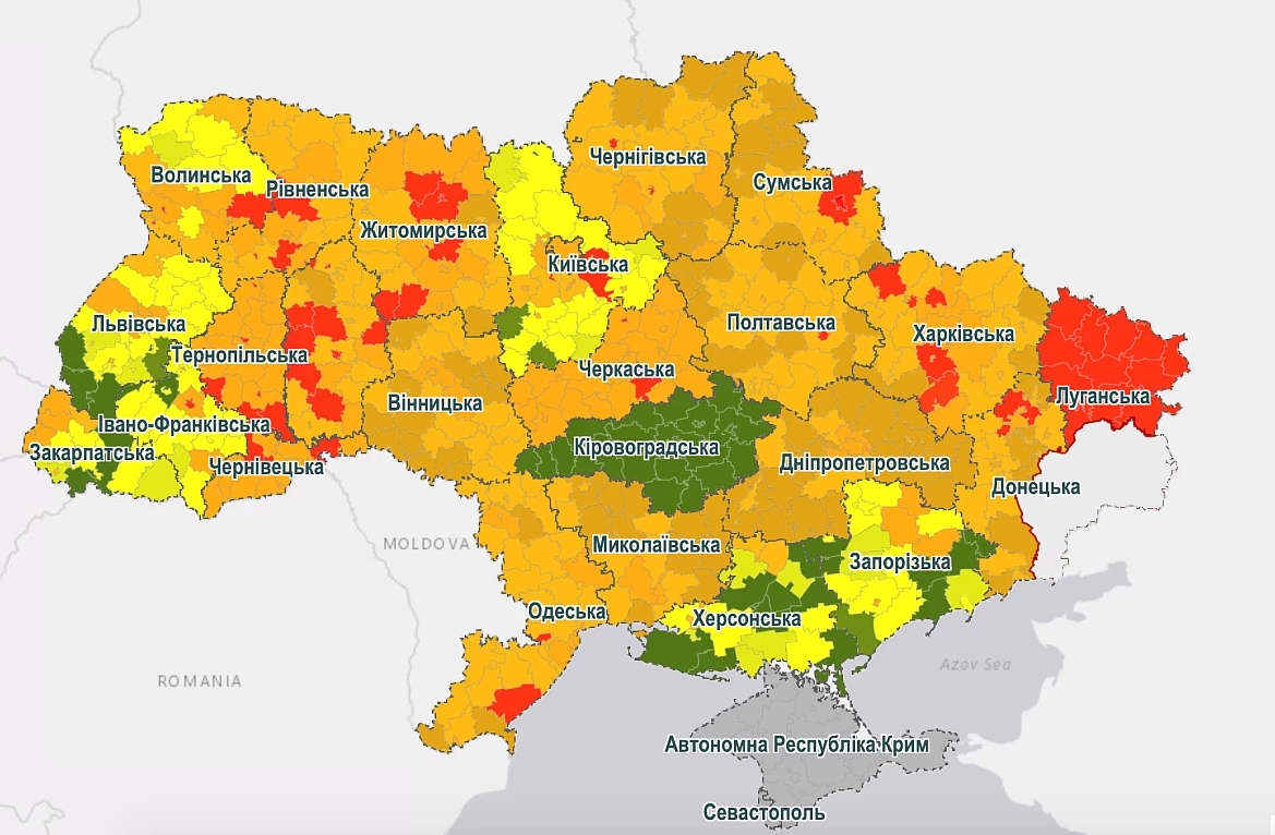 В красную зону вошли: Сумы, Ивано-Франковск, Лисичанск, Полтава, Тернополь, Харьков, Хмельницкий, Черновцы, Чернигов.