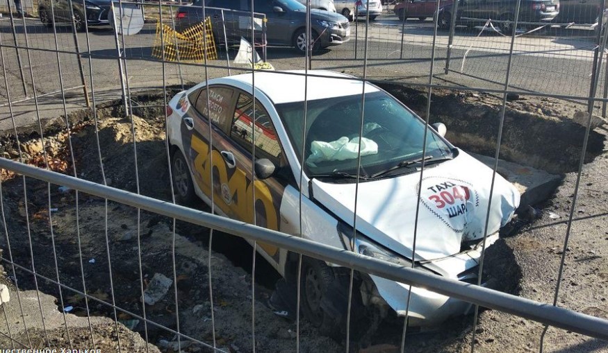 Автомобиль службы такси провалилась в яму вырытую коммунальщиками. ДТП произошло на улице Богдана Хмельницкого, сообщает "Суспільне".