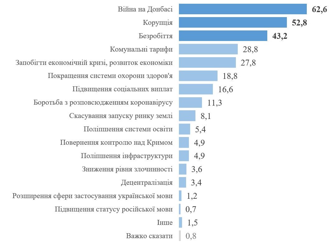 Топ-3 проблемами, по мнению респондентов (которым предлагался перечень), является война на Донбассе (63% респондентов относят эту проблему в топ-3), коррупция (53%) и безработица (43%).