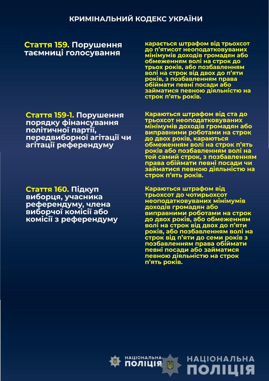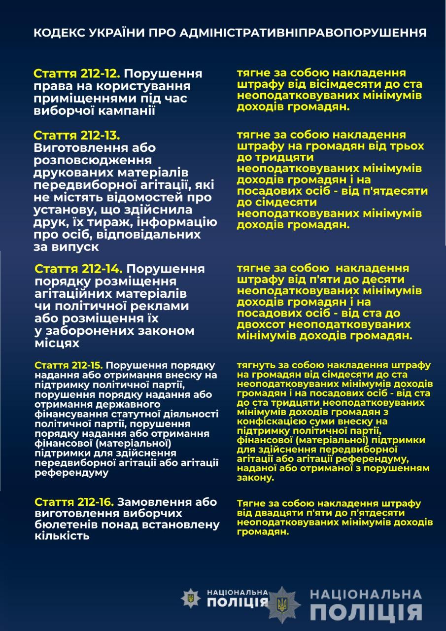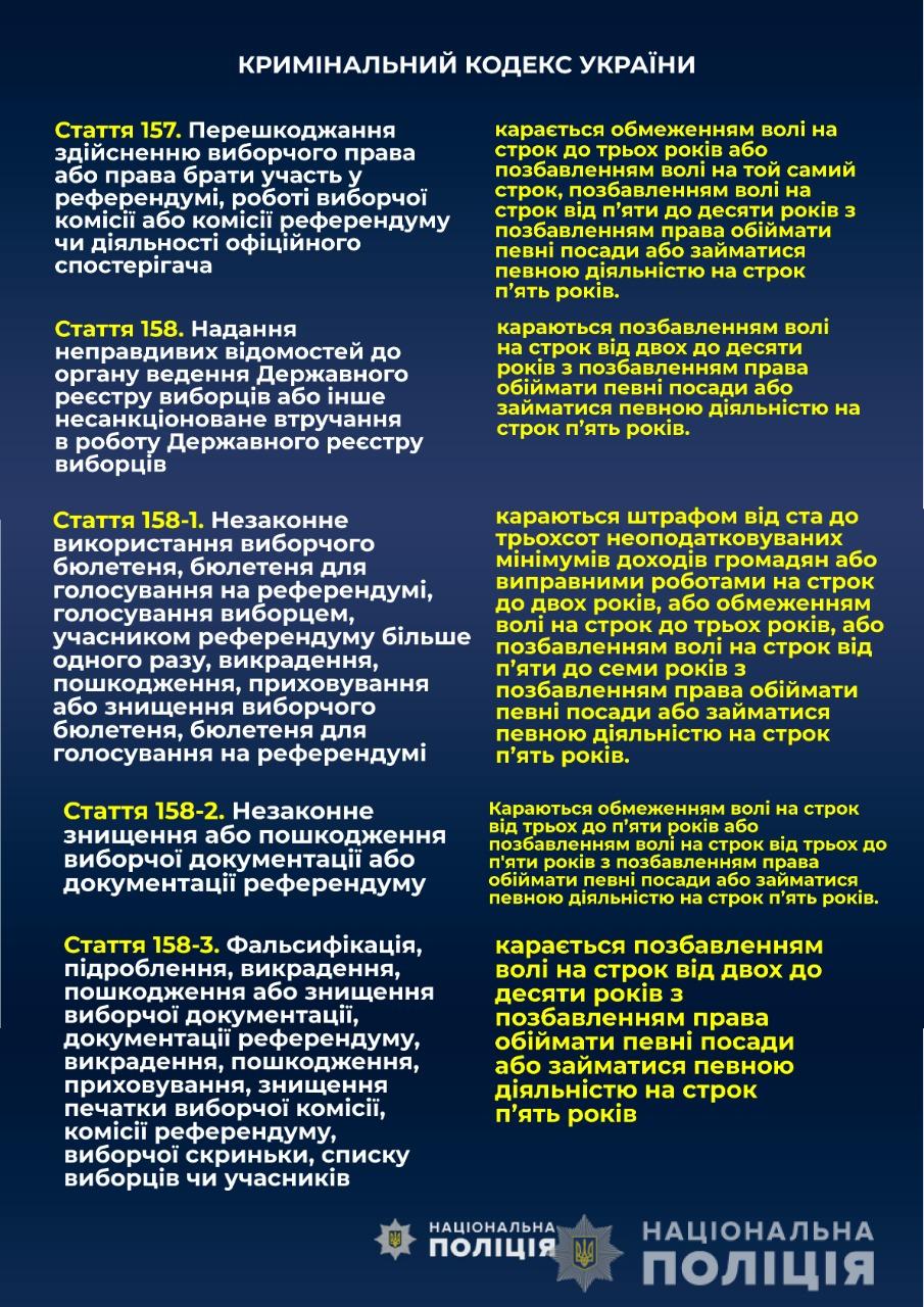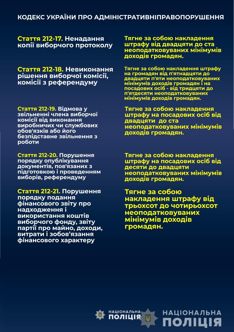Согласно части 7 статьи 23 «Публичность и открытость избирательного процесса» Избирательного кодекса Украины, органы Национальной полиции Украины за день до дня голосования обнародуют на официальных сайтах предварительные сведения о количестве зарегистрированных обращений о нарушении избирательного законодательства во время соответствующего избирательного процесса и роз ' объяснения ответственности за нарушение законодательства о выборах.