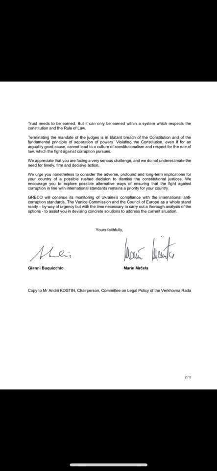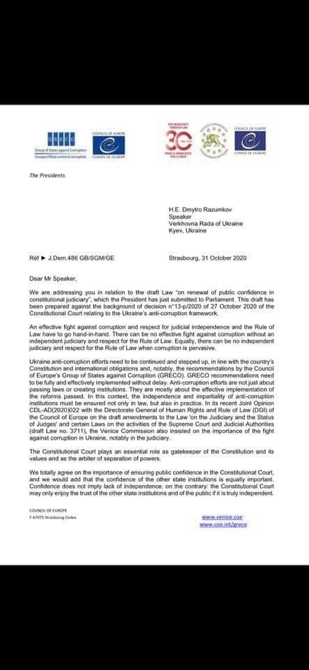 Об этом говорится в совместном письме Венецианской комиссии и Группы государств против коррупции (GRECO) к спикеру ВР Дмитрию Разумкову.
