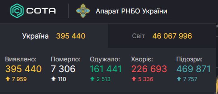В Украине на утро 1 ноября зафиксировано более 395 тыс. случаев коронавирусной болезни COVID-19, прирост случаев за сутки - более 7,9 тысяч.