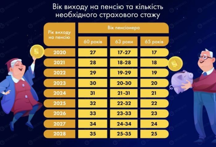 Так, в Украине поэтапно повышается требование для выхода на пенсию в 60 лет. В 2020-м это 27 официально отработанных лет, а в 2021-м – уже 28 лет. В 2028-м граница увеличится до 35. Что это означает? К примеру, если вам сейчас 40 лет, у вас уже должно быть минимум 15 лет стажа.