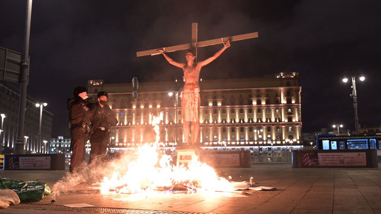 Сотрудники полиции задержали на Лубянке в центре Москвы акциониста Павла Крисевича, который был там в образе Иисуса Христа.