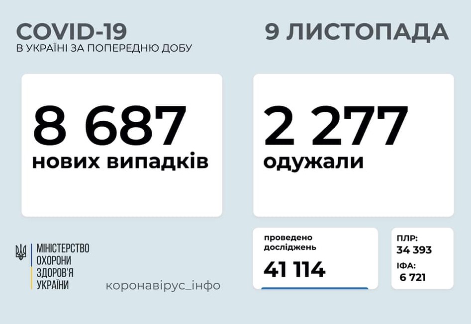 В Украине по состоянию на утро понедельника, 9 ноября, зафиксированы 8 687 новых случаев заболевания коронавирусной болезнью COVID-19 за сутки. За сутки умерли 115 человек, выздоровели 2 277 человек.