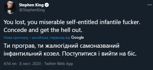 Он написал: "Америка – Трампу: Ты уволен". 8 ноября, уже после того, как Трамп не признал победу Байдена, Кинг добавил в нецензурной форме: "Ты проиграл, жалкий самозванец, инфантильный козёл. Смирись и убирайся к черту".