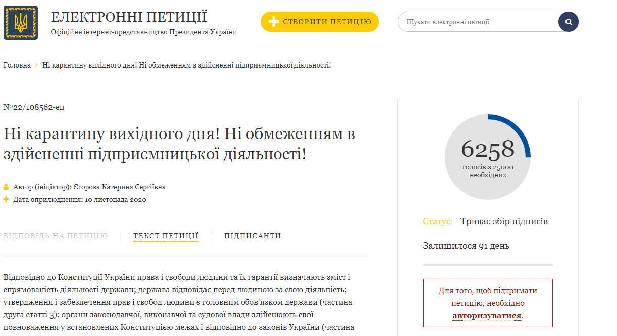 "Введение карантина выходного дня, в случае утверждения правительством, будет иметь катастрофические последствия для экономики и социокультурной жизни украинского общества, повлечет полную потерю прибылей, приведет бизнес к нерентабельности и закрытию", - сказано в тексте петиции.
