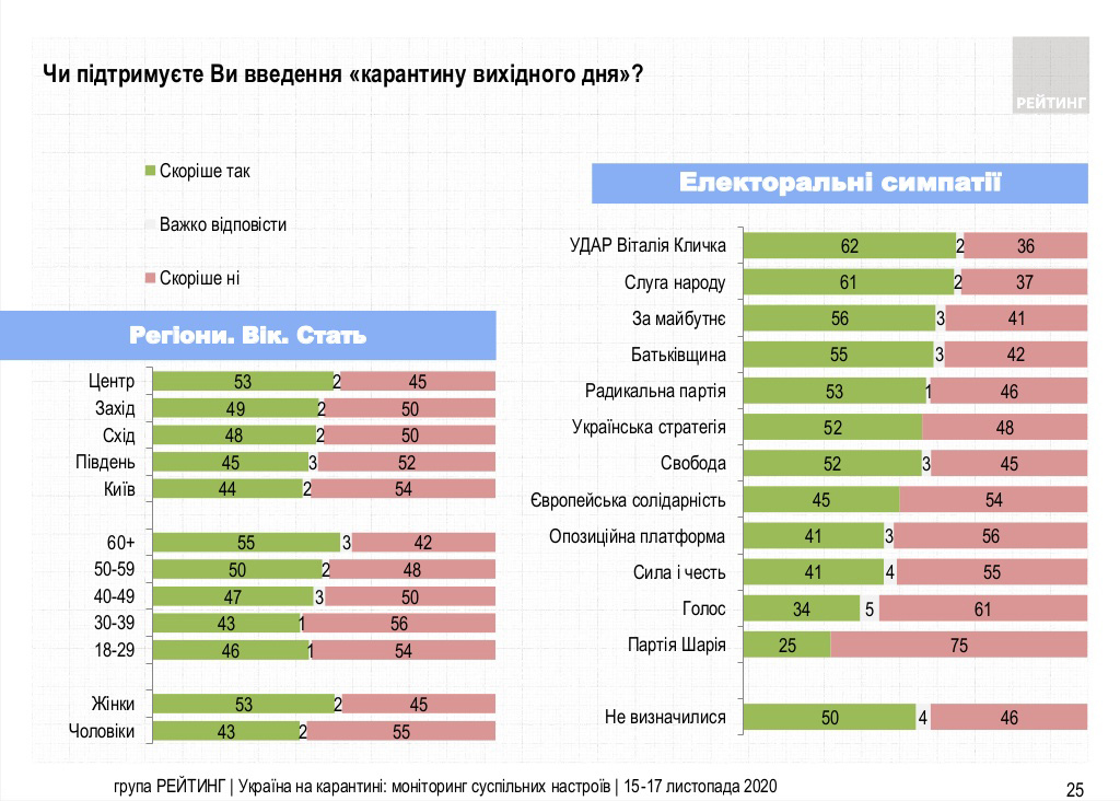 Наибольшая поддержка карантина выходного дня – среди избирателей партии УДАР Виталия Кличко (62%) и Слуги народа (61%). Наименьшая – среди сторонников Партии Шария (25%) и Голоса (34%).