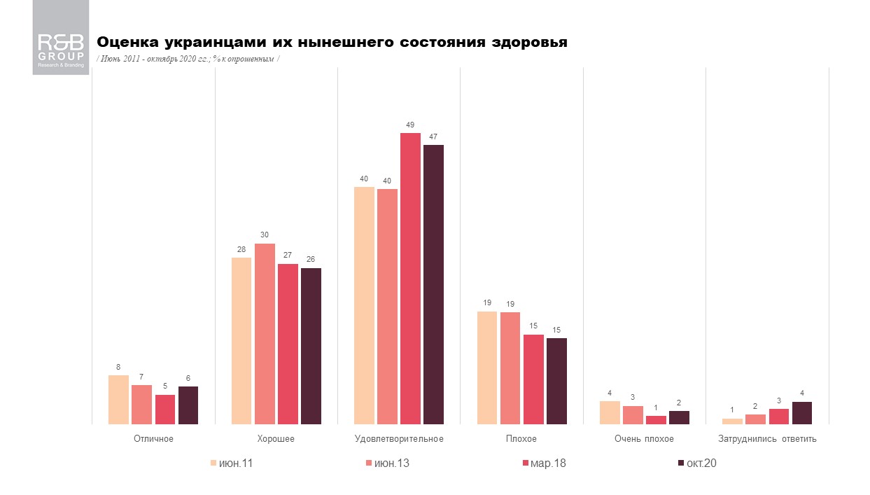 Почти половина украинцев (47%) считают свое нынешнее состояние здоровья удовлетворительным, 26% - хорошим, 6% - отличным. При этом 15% считают состояние здоровья плохим, 2% - очень плохим, а 4% опрошенных не определились с оценкой.