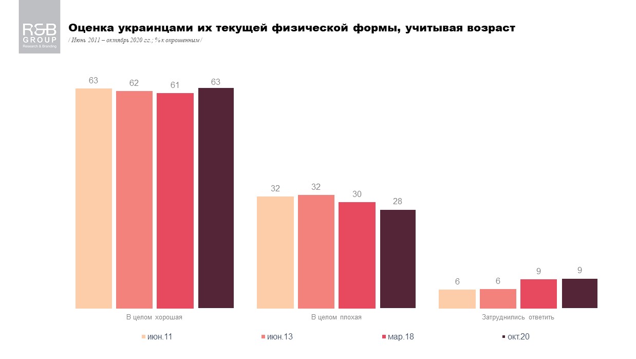 Более оптимистичны украинцы в оценке своей физической формы учитывая возраст. Так, две трети опрошенных (63%) считают свою физическую форму в целом хорошей, тогда как противоположной точки зрения придерживается 28% респондентов, а еще 9% — не определились. Следует отметить, что подобное разделение практически неизменно на протяжении последних 9 лет.