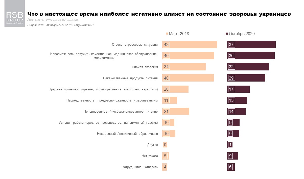 По мнению украинцев, наиболее негативное влияние на их здоровье оказывают стресс и стрессовые ситуации (37%), невозможность получить качественное медобслуживание и медпрепараты (36%), плохая экология (32%) и некачественные продукты питания (29%). Далее следуют такие факторы как вредные привычки (17%), наследственность и предрасположенность к заболеваниям (15%), неполноценное или несбалансированное питание (14%), а также неблагоприятные условия работы и нездоровый / неактивный образ жизни (по 9%).