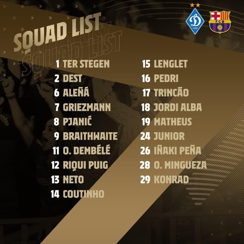 Всего в заявку вошло 19 футболистов. Как сообщает официальный сайт каталонцев, вне этого списка остались Месси и нидерландский полузащитник Френки Де Йонг. В обоих случаях Куман объяснил свое решение предоставлением обоим игрокам отдыха. "Мы решили не брать Месси и Де Йонга в Киев из-за нашей ситуации в группе Лиги чемпионов. Она комфортная для нас, а им нужен отдых".