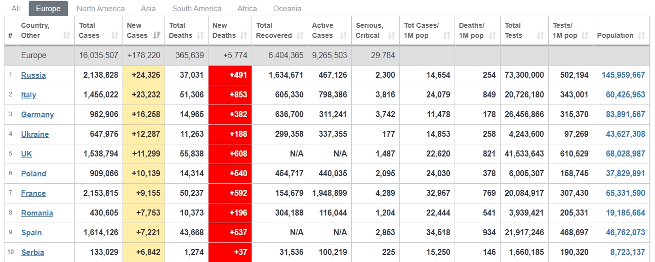 Об этом свидетельствуют данные Worldometers.