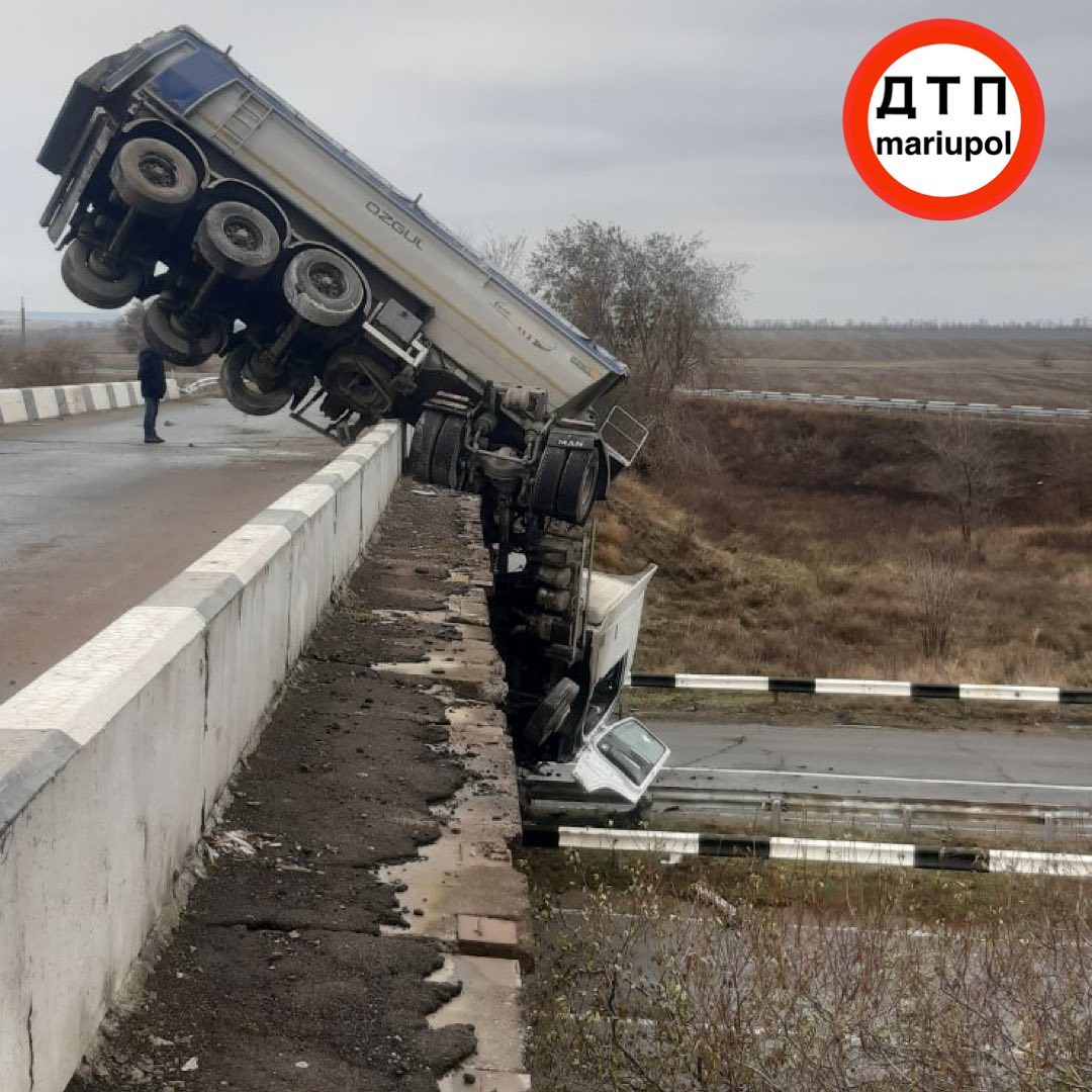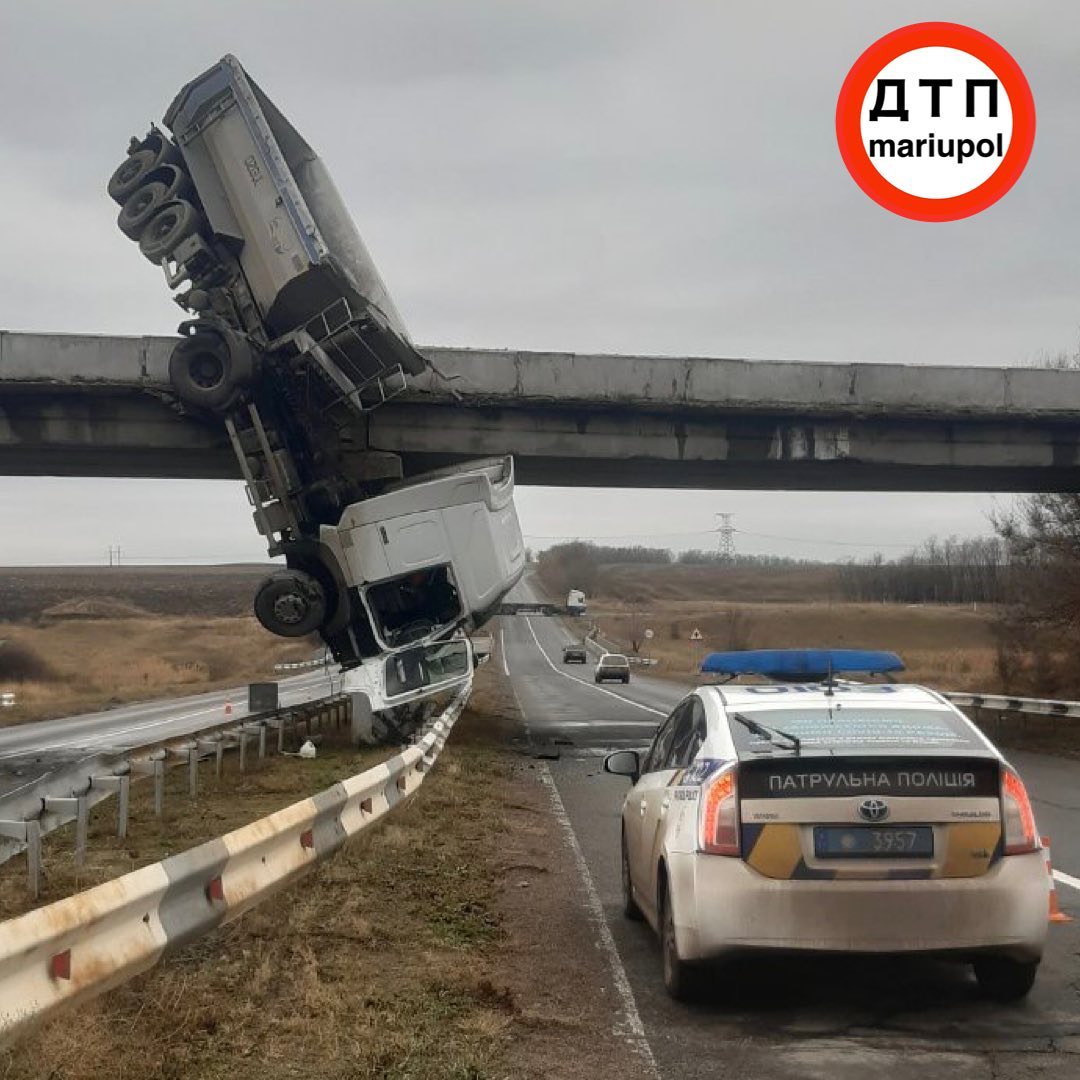ДТП произошло около 5:00 утра на трассе Мариуполь - Волноваха. В результате происшествия водитель не пострадал - ему удалось выбраться из кабины, которая повисла в над землей.