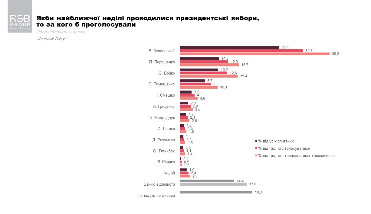 За действующего президента Украины Владимира Зеленского готовы проголосовать 26,4% всех украинских избирателей в случае проведения внеочередных президентских выборов в ближайшее воскресенье или 39,8% тех, кто намерен участвовать в голосовании и определился с выбором кандидата.
