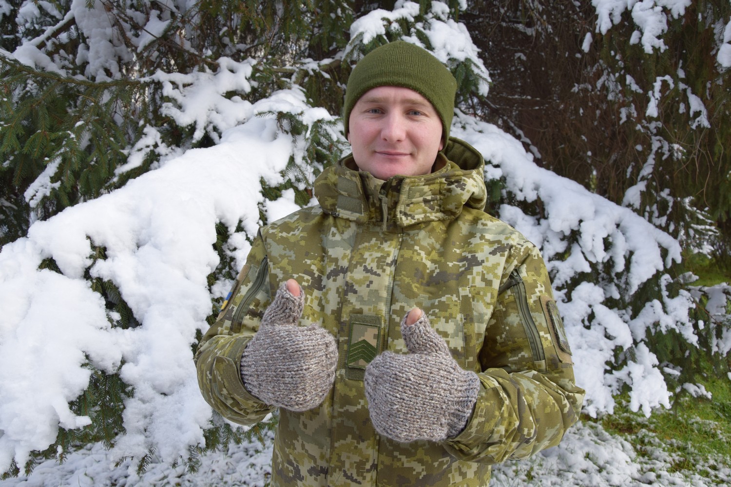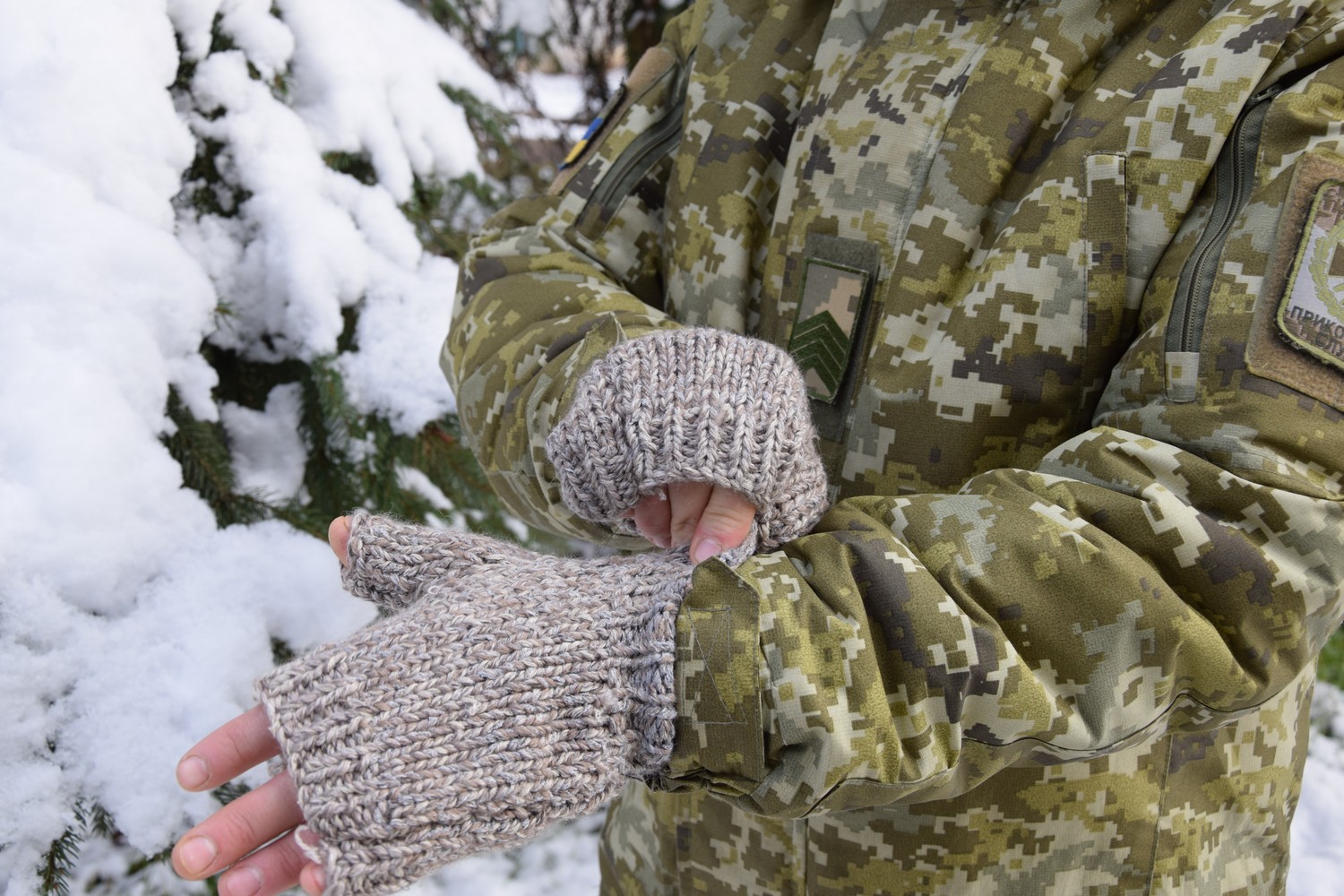 Перчатки практичные, связанные с учетом специфики выполнения задач военнослужащими - чтобы можно было открытыми пальцами работать. Цвета также подобраны так, чтобы подходили к месту и условиям несения службы.
