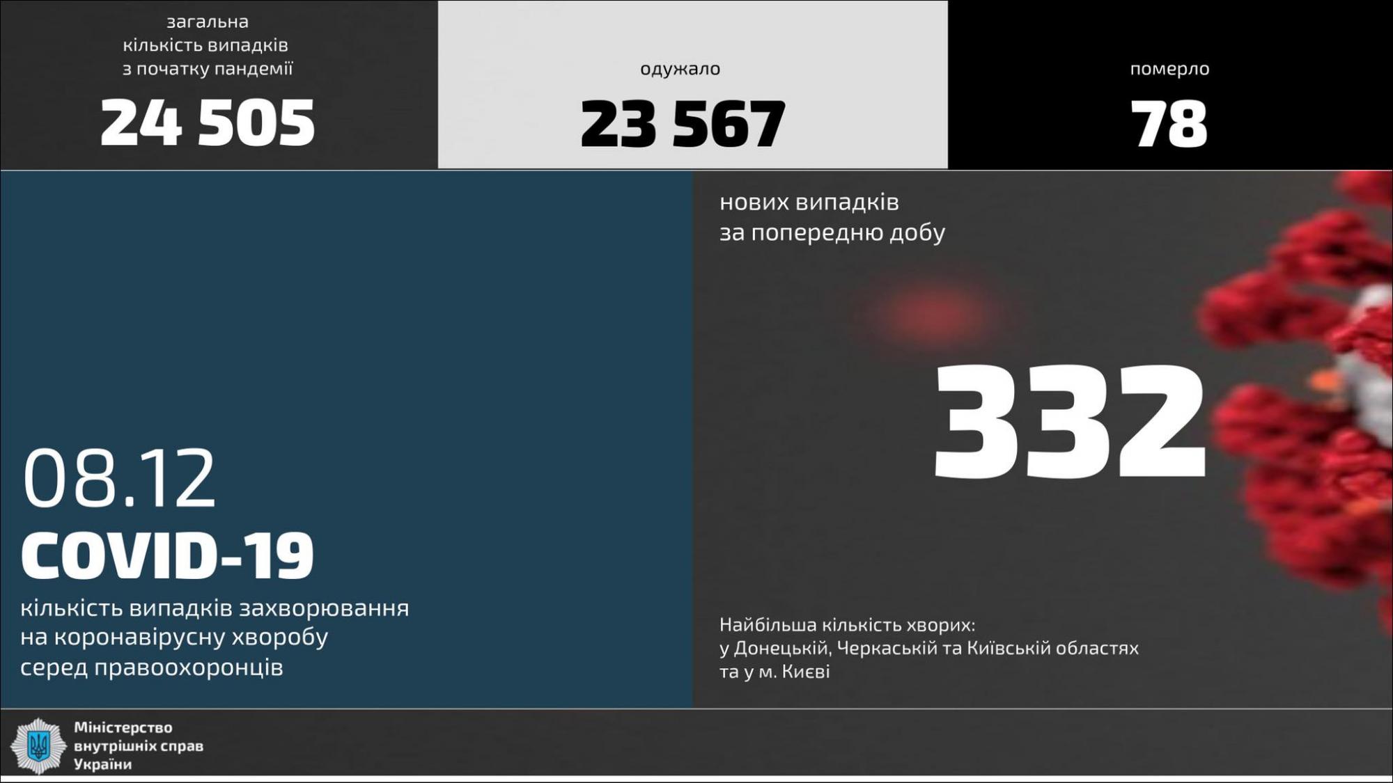 С начала пандемии COVID-19 у 24 505 правоохранителей МВД было диагностировано заболевание. Выздоровели 23567 человек, умерло от коронавирусной болезни - 78 человек.