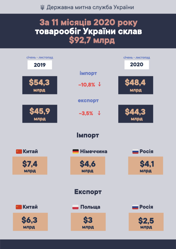 Экспортировали из Украины в Китай продукции на - $ 6,3 млрд, в Польшу - на $3 млрд, Россию - $2,5 млрд.