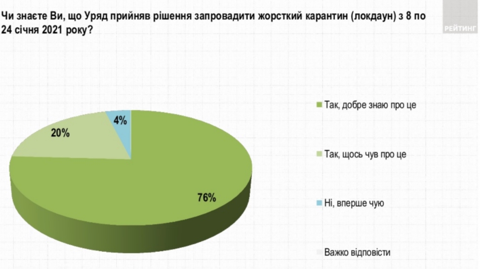 Согласно опросу 76% хорошо осведомлены, что в Украине введут жесткий локдун с 8 по 24 января 2021, 20% что-то слышали об этом, а 4% не знают об этом.