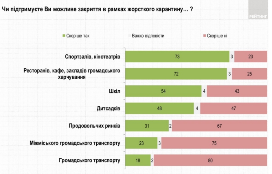Более 70% опрошенных поддерживают закрытие в пределах жесткого карантина спортзалов, кинотеатров, ресторанов и кафе. За закрытие школ выступают 54%, детсадов - 48%. Меньше поддерживают закрытие продовольственных рынков (31% - за), междугородного транспорта (23%) и городского транспорта (18%).