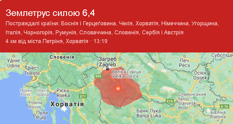 Землетрясение магнитудой 6,4 произошло в Хорватии к югу от столицы страны Загреба, сообщил во вторник Европейско-Средиземноморский сейсмологический центр.