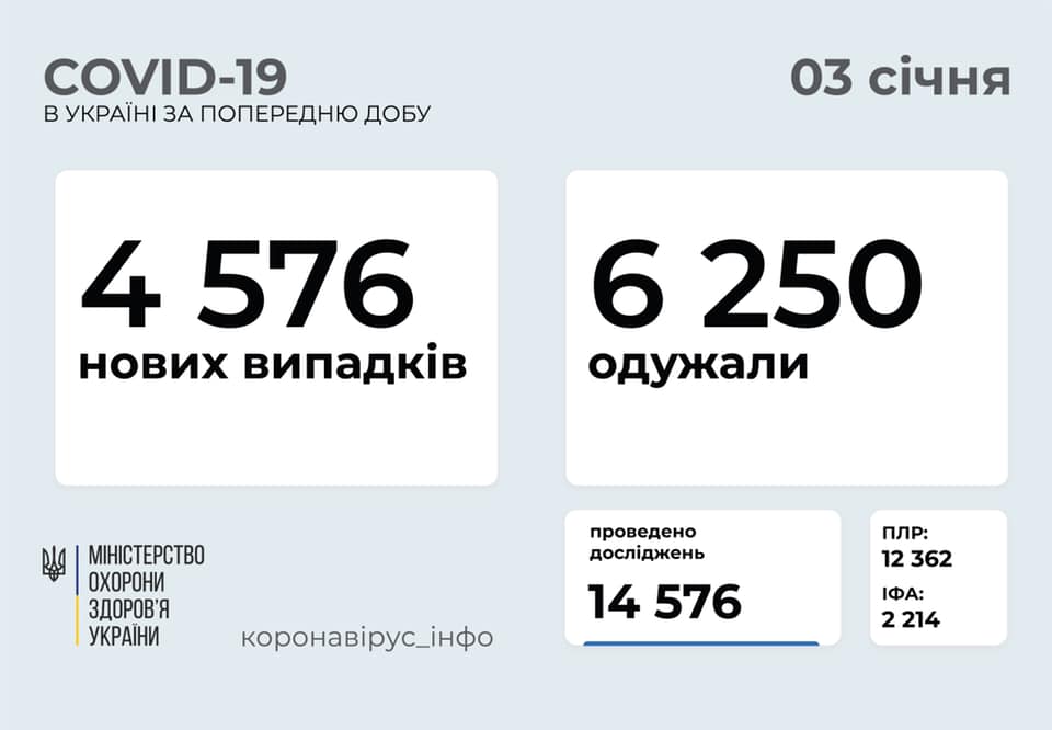 4576 новых случаев коронавирусной болезни COVID-19 зафиксировано в Украине на 3 января 2021 года. В частности, заболели 158 детей и 172 медработника.