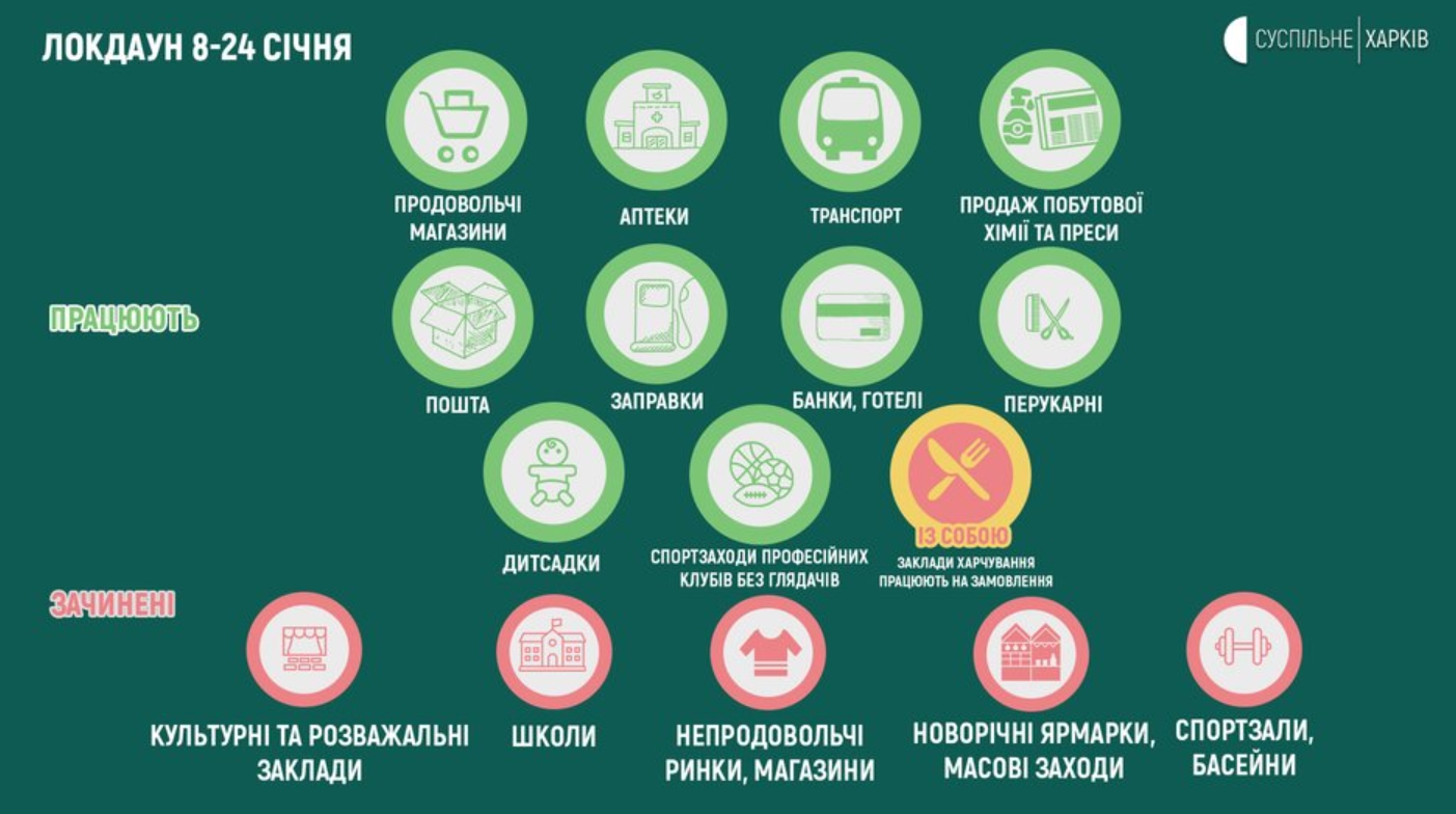 С 8 по 24 января в Украине вводятся дополнительные карантинные ограничения. Закрываются развлекательные учреждения и учреждения культуры, школы, непродовольственные рынки, запрещены массовые мероприятия.