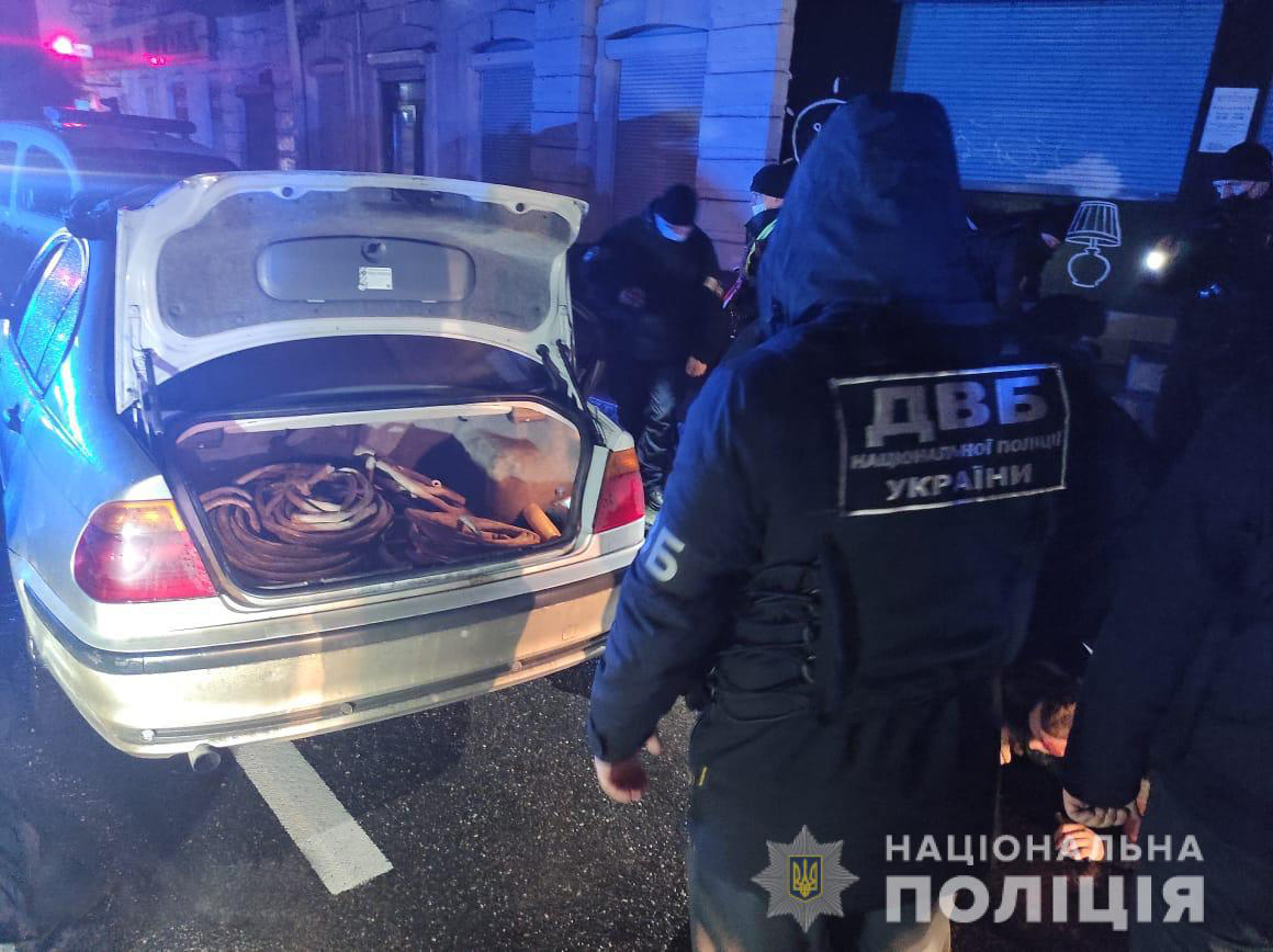 Злоумышленников задержали около полуночи на одной из улиц Харькова: они сломали крышку смотрового люка в хранилище магистральных линий связи, заготовленным инструментом перекусили кабель и погрузили его в автомобиль, на котором приехали. С вещественными доказательствами полицейские и двое гражданских лиц были задержаны оперативниками внутренней безопасности Нацполиции и СБУ.