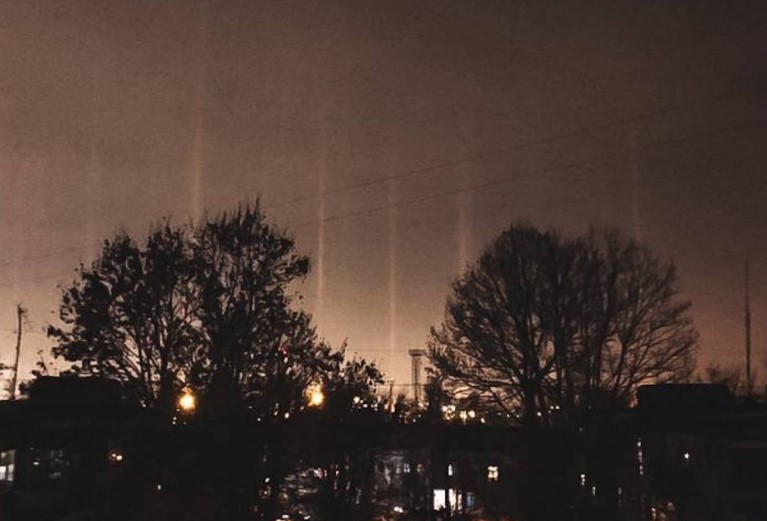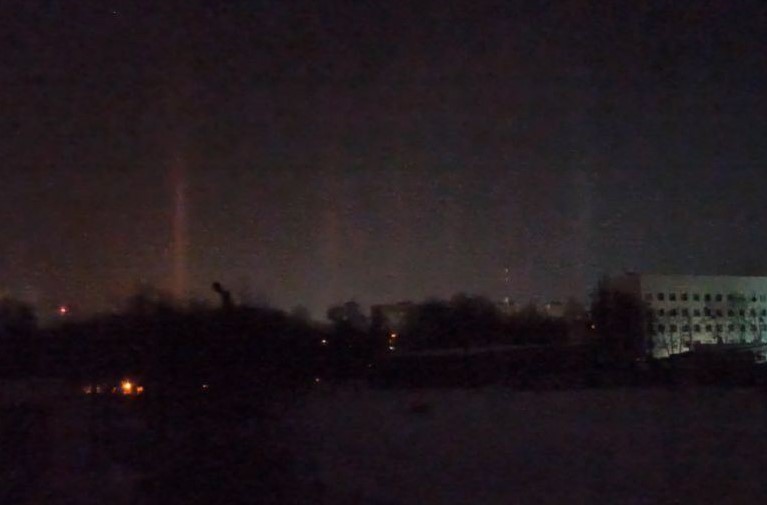 На самом деле, это обычное погодное явление. В мороз и при высокой влажности световые столбы появляются над фонарями и другими источниками света. Он отражается от кристаллов льда.