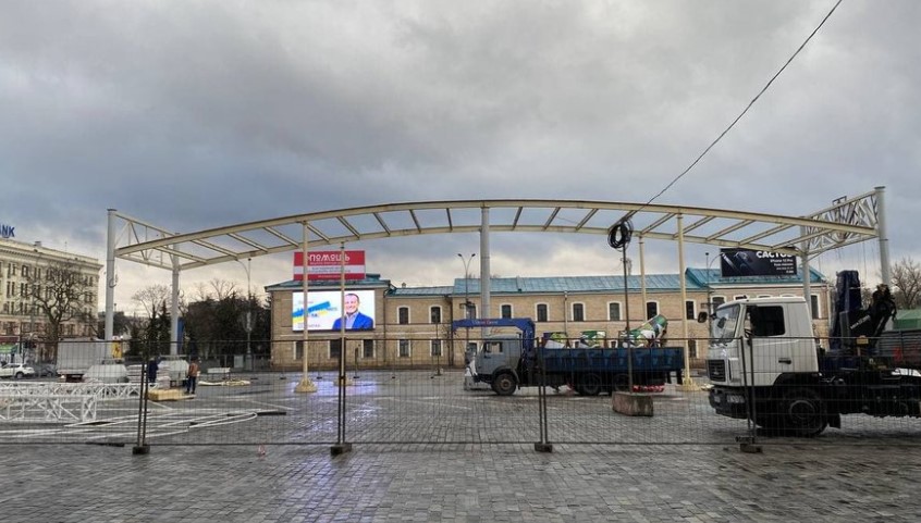 Как сообщает "Суспільне", рабочие убирают навес, далее - демонтаж елки.