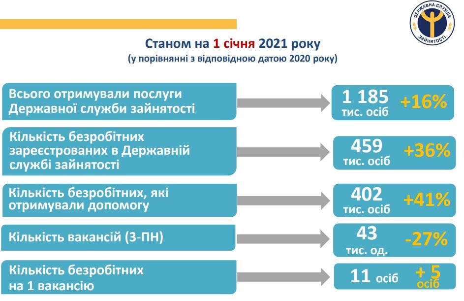 Количество официально зарегистрированных безработных в Украине выросло на 36% за 2020 год – до 459 тысяч человек. Из них по состоянию на 1 января 2021 года денежную помощь от государства получали 402 тыс. человек – на 41% больше, чем в начале 2020 года.