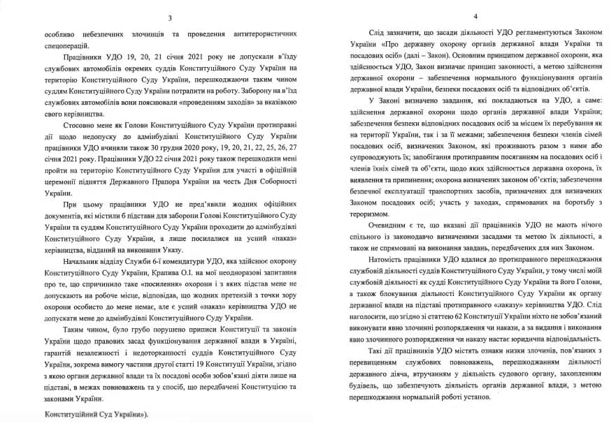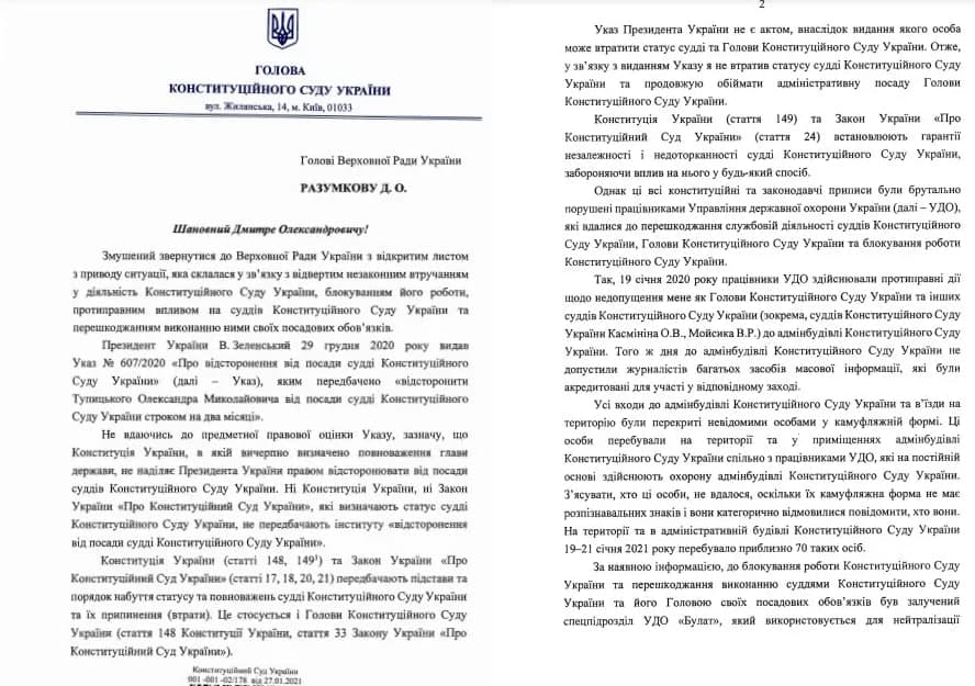 "Вынужден обратиться в Верховную Раду с открытым письмом по поводу ситуации, сложившейся в связи с откровенным незаконным вмешательства в деятельность Конституционного Суда Украины, блокированием его работы, противоправным влиянием на судей КСУ и препятствием выполнению ими своих должностных обязанностей", – говорится в документе.