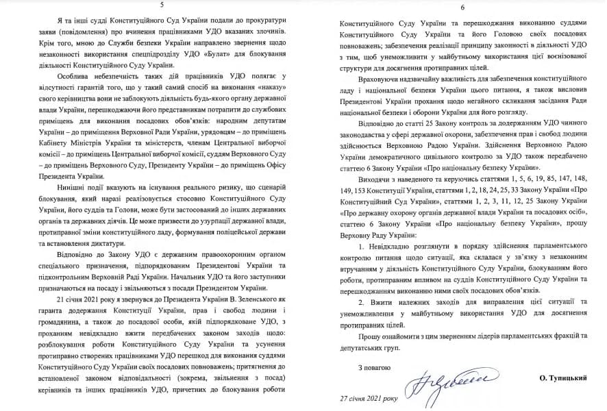 Отстраненный глава Конституционного Суда Александр Тупицкий пожаловался председателю Верховной Рады Дмитрию Разумкову на сотрудников государственной охраны, которые не пускали его на рабочее место. В частности, Тупицкий указал дни, когда его не пропускали в здание суда.