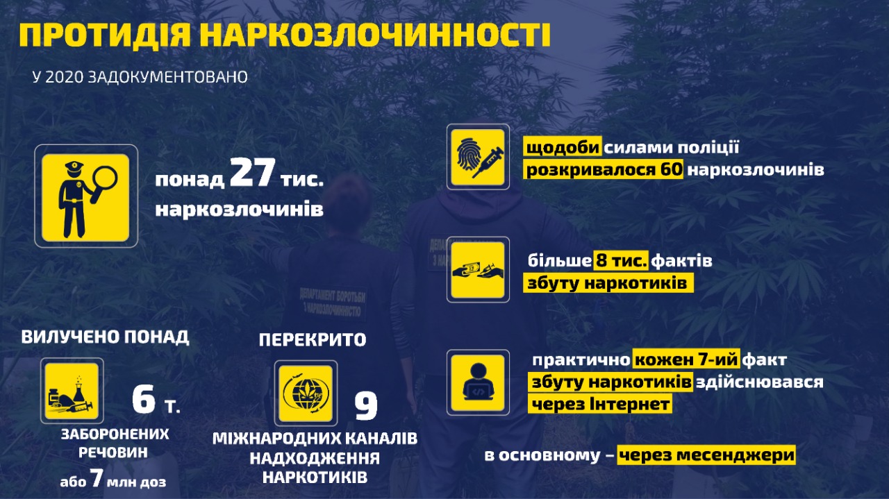 "Еще одна проблема - наркопреступность. Ее объемы немалые - в 2020-м задокументировано более 27 тыс. таких уголовных правонарушений. При этом ежесуточно силами полиции раскрывалось 60 наркопреступлений. Из общего количества зарегистрированных - более 8000 фактов сбыта наркотиков. И практически каждый 7-й сбыт осуществляется через Интернет", - сообщил глава Нацполиции.