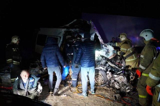 Источник «Интерфакса» сообщает, что точное число погибших не удается установить, потому что автобус практически полностью уничтожен. Причиной ДТП, по предварительной версии, стали плохие погодные условия: фуру с прицепом занесло, в результате чего произошло лобовое столкновение с автобусом.