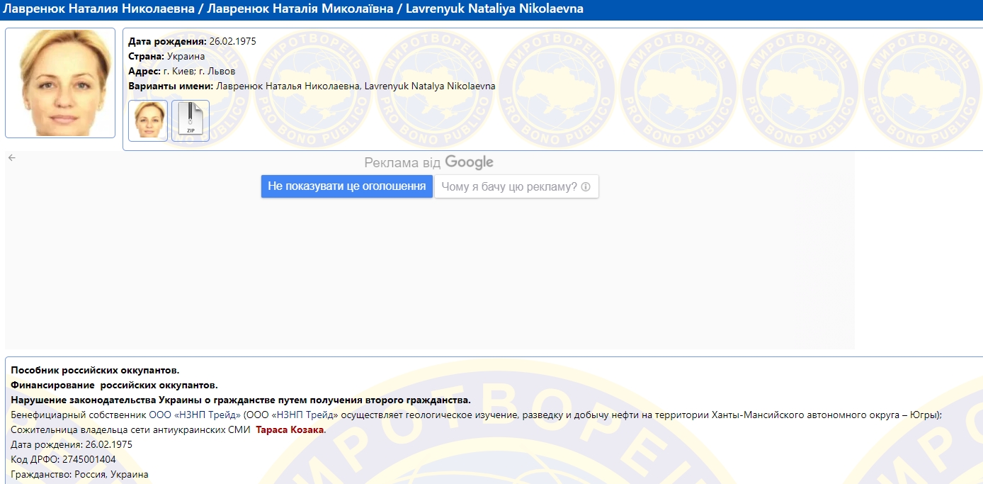 На сайте указывается, что Лавренюк является пособником российских оккупантов. "Миротворец" инкриминирует ей финансирование российских оккупантов и нарушение законодательства Украины о гражданстве путем получения второго гражданства.