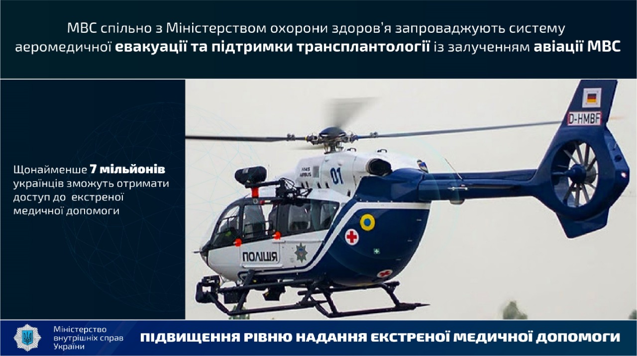 «В этом году совместно с Министерством здравоохранения мы введем систему аэромедицинской эвакуации и поддержки трансплантологии с привлечением авиации МВД. Это существенно повысит уровень оказания экстренной медицинской помощи в регионах. По меньшей мере 7 млн украинцев смогут получить максимально быстрый доступ к особой медицинской помощи в ситуациях, угрожающих их жизни и здоровью», - сказал Арсен Аваков.
