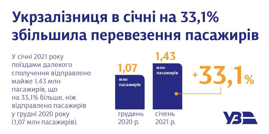 Укрзализныця в январе 2021 года поездами дальнего сообщения отправила почти 1,43 млн пассажиров, что на 33,1% больше, чем было в декабре 2020 года (1,07 млн пассажиров).