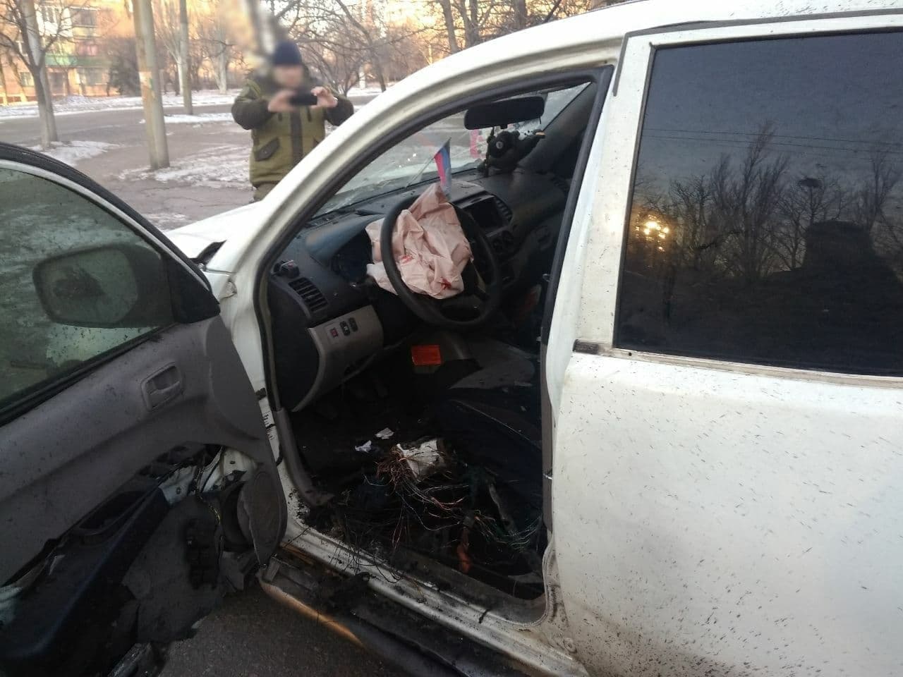 Военный получил множественные осколочные ранения ног. В машине с ним находилась дочь, сейчас оба находятся в больнице.