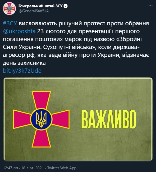 "Вооруженные Силы Украины выражают решительный протест против избрания Укрпочтой даты 23 февраля для презентации и первого погашения почтовых марок под названием «Вооруженные Силы Украины. Сухопутные войска».