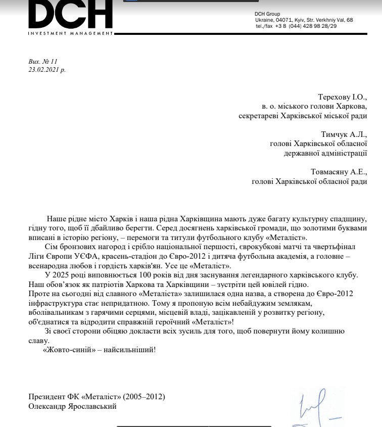 UPD 16:20 Александр Ярославский заявил о желании и намерении возродить харьковский клуб в открытом письме, которое адресовано и.о. городского головы Харькова Игорю Терехову, председателю Харьковской областной государственной администрации Айне Тымчук и председателю Харьковского областного совета Артуру Товмасяну.